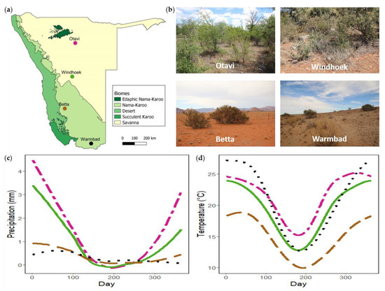 (a) Map of Namibia indicating the geographical location of the Stegodyphus dumicola Pocock, 1898 study populations with the different biomes (redrawn from [45]). (b) Site photos of the four sampling sites. (c) Daily average precipitation for each site. (d) Daily average temperature for each site.