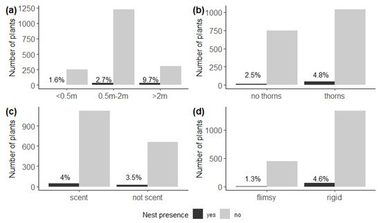 We found relatively more nests on plants higher than 2 m (χ2 = 39.6, df = 2, p < 0.001) (Figure 3b), and on host plants with thorns (χ2 = 5.72, df = 1, p = 0.02) (Figure 3b), and also on plants with a woody rather than flimsy structure (χ2 = 9.23, df = 1, p < 0.01) (Figure 3d). We detected no effect of scent on nest presence (χ2 = 0.18, df = 1, p = 0.67) (Figure 3c).