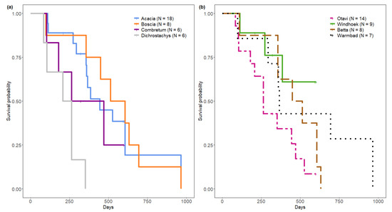 Kaplan Meier survival analysis of Stegodyphus dumicola Pocock, 1898 nests, t0 = sampling start. (a) Nest survival per nesting plant genus. (b) Nest survival per population.