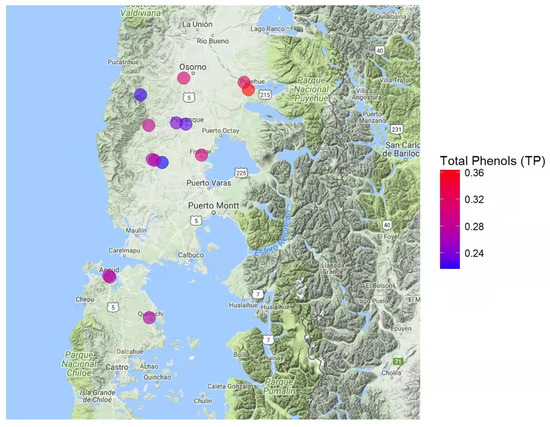 Map of the Los Lagos Region (Chile, 39°16′ S to 44°04′ S) indicating the sampled hive locations and respective phenol contents in honey samples. Contents concentration is indicated by a color scale going from blue (lower contents) to red (higher contents).