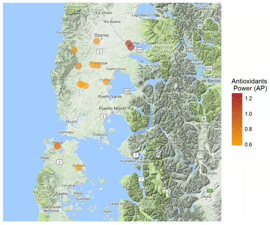 Map of the Los Lagos Region (Chile, 39°16′ S to 44°04′ S) indicating the sampled hive locations and respective antioxidant power of honey samples (mg of ascorbic acid equivalents/g of sample). Antioxidant power is indicated by a color scale going from light orange (lower power) to dark orange (higher power).