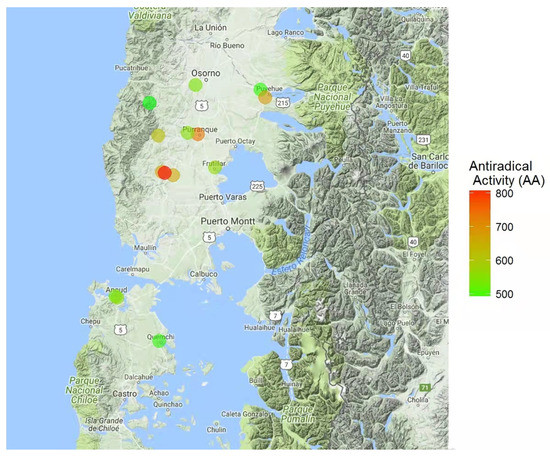 Map of the Los Lagos Region (Chile, 39°16′ S to 44°04′ S) indicating the sampled hive locations and respective antiradical activity of honey samples. Antiradical activity is indicated by a color scale going from green (lower activity) to red (higher activity).