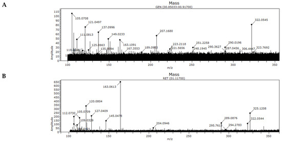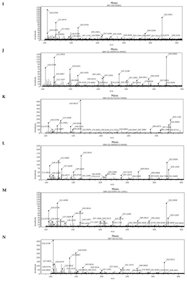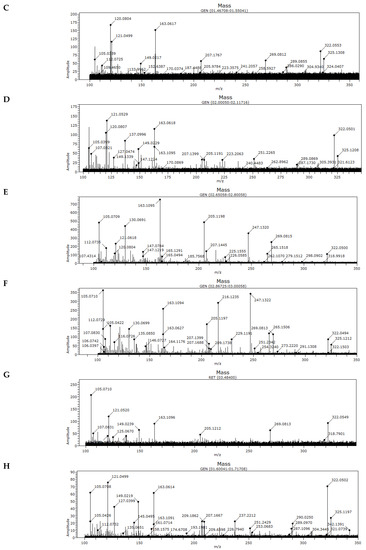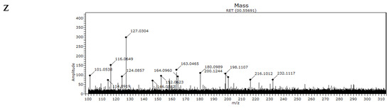 In this study, six signals were regularly detected for the honeys analyzed. However, three of these were observed without exception in all honeys. Likewise, the obtained mass spectrometry signals for the control sample differed from honey samples A–N. For example, an m/z value of 105.0708 was detected in honey samples A–N, but not in honey sample Z (control). The same case was noted for m/z values of 322.0545. In addition to this, the signal corresponding to the m/z value 163.1093 was observed both in the selected honeys and in the control sample. This suggests the presence of a signal that could be an element to identify honeys independently of their geographical origin (Table 2).