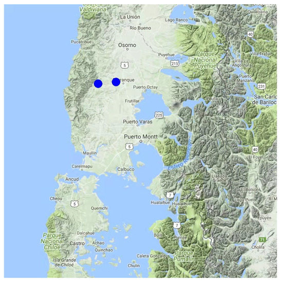 Map of the Los Lagos Region (Chile, 39°16′ S to 44°04′ S) indicating the two hive locations where beeswax samples tested positive for the pesticide fenhexamid.