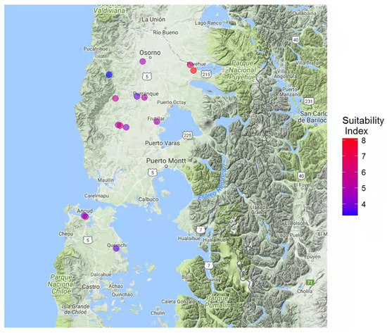 Map of the Los Lagos Region (Chile, 39°16′ S to 44°04′ S) indicating the most suitable areas for apiculture. The suitability index is indicated by a color scale going from blue (more suitable) to red (less suitable).