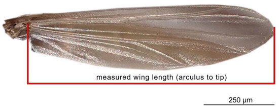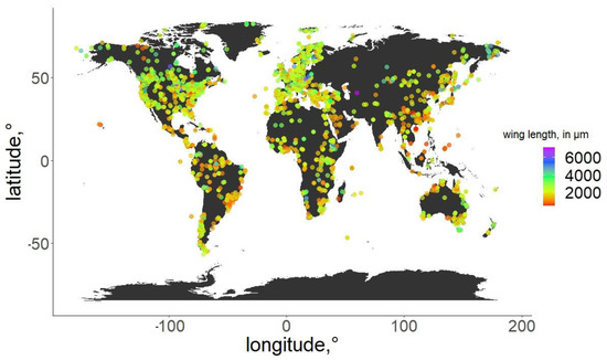 For the specimens from the ZSM, we photographed the right wing of each specimen and measured it directly. In cases when the right wing was damaged, the left wing was photographed and measured instead. Images were taken using a DCM 510 ocular camera in conjunction with a Leitz Diaplan Microscope, using ×2.5 magnification, to nearest 10 µm, to capture the entire wing in a single image. All ZSM specimens measured were previously mounted on permanent microscope slides, either in Canada Balsam or Euparal. Wing length was measured as per standard procedure [31]: from the arculus sclerite proximally at the wing and the outermost point of the distal end (Figure 1). Measurements were taken from photos using Fiji (ImageJ public domain [32]). The geographic distribution of the measured specimens, and their wing lengths, are depicted in Figure 2. Geographic coordinates were either taken directly or estimated (from the geographic data provided) from labels or descriptions (when available). The database in its entirety is available as supplementary File S3. For every measured specimen, we extracted the geographical coordinates at which it was collected. Coordinates were taken either as provided by the authors of the published works, or inferred from the labels of the permanent slides, using Google maps, when necessary.