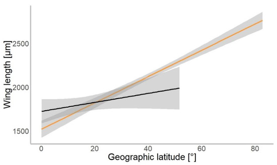 Chironomidae wing length across the latitudinal gradients. Orange line shows distribution of wing length in the Northern, and black in Southern hemisphere (for all data points plotted, see Figure S1).