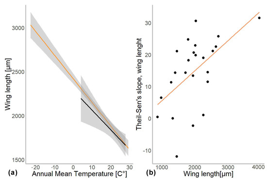 (a) Chironomidae wing length across the temperature gradients. Orange line shows distribution of wing length in the Northern hemisphere, and black in Southern. (b) Changes in wing length along latitudes (expressed as Theil-Slope) in relation to the average wing length of the genus (un-standardized length).