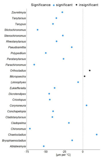 In another model, we substituted latitude by the mean annual temperature for the coordinates from which specimen came. In this gls model, the mean annual temperature was a significant predictor of the mean wing length (χ2 = 548.52, p = 0.001). The genus to which a specimen belongs had a significant effect (χ2 = 4107.34, p = 0.001), as well as interaction of mean annual temperature with hemisphere (χ2 = 6.11, p = 0.01; see Table 2). Hemisphere had no effect on the wing length (χ2 = 3.26, p = 0.07). The mean wing length of non-biting midges, decreased by 32.4 µm for every 1 °C of temperature increase (residual standard error 870.5, p < 0.001). The Theil-Sen’s slope illustrates the significant interaction between mean annual temperature and wing length within genus. As such, 20 out of 24 genera showed decrease in the wing length with the increase of mean annual temperature, two genera showed increase (Chaetocladius and Corynoneura) and two more genera showed no significant pattern (genera Orthocladius and Micropsectra; Figure 5).