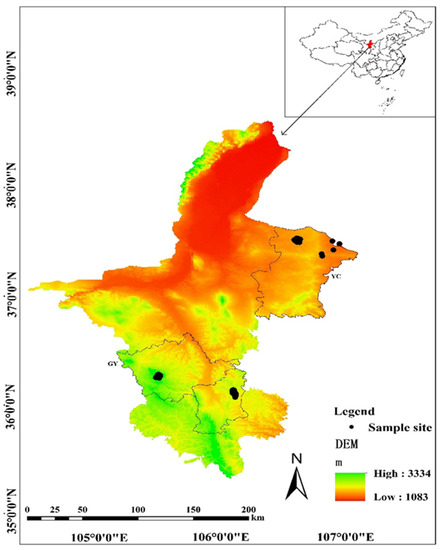 The location of sampling sites and region boundaries within Ningxia Province, northwestern China (YC, Yanchi region; GY, Guyuan region).