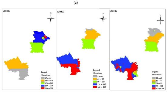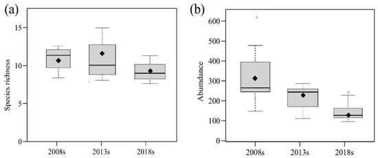 At all sites combined, the year had an obvious negative influence on species richness and abundance (Table 2). The species richness and abundance were substantially lower in later years than in earlier ones. The abundance decreased over time but revealed an overall decrease, with the strongest declines being from 2008 to 2013 (Figure 2). The species richness and abundance per survey decreased over time by approximately 0.2% (Figure 2a) and 11.2% (Figure 2b), respectively.