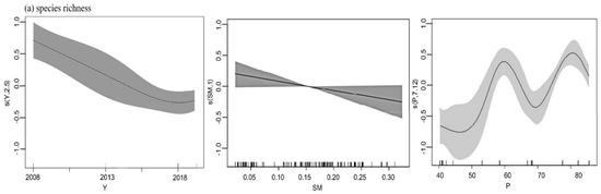 | Species richness | P + SM + Year | 88.16 | *** | 0.579 | 0.11 | 60.1% |