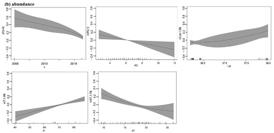 | Abundance | Year + P + Lat + PD + ST | 64.55 | *** | 0.506 | 0.31 | 71.9% |