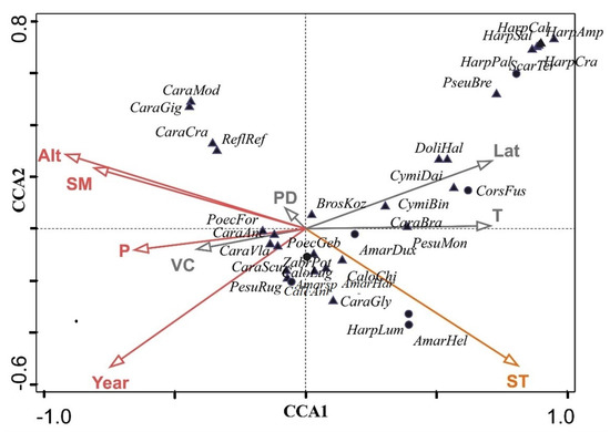Environmental data alone are generally deficient in explaining changes in insect communities [67]. We overcame this problem by linking environmental data to the carabid beetle survey data and to the data describing vegetation changes [68]. Making the relationship between environmental and vegetation variables, and their effect on carabid beetles explicit requires careful studies and long-term monitoring. The model revealed that precipitation had significant effects on species abundance and richness in our dataset. On the regional scale, abundance was significantly influenced by precipitation, soil temperature, plant diversity, and latitude, and the species richness was mainly affected by precipitation, soil moisture, and latitude. Moisture changes also affected vegetation, which could have knock-on influences on the micro-climate. The importance of precipitation changes could be explained by the free-ranging lifestyle of immature larval stages. It is known that an increase in precipitation can enhance the aboveground vegetation biomass [69]. Vegetation provides food for herbivorous beetle species and shelters for predatory species and may facilitate the richness of greater carabid species. We found that soil temperature also had a significant effect on abundance because some beetles lay eggs in burrows and others overwinter as larvae or adults in the soil, so a warmer temperature can stimulate the number of beetles, their range of activity, and therefore, beetle abundance [70,71].