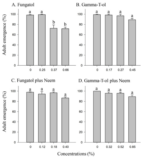 Effect of different concentrations of Fungatol (A), Gamma-T-ol (B), Fungatol plus neem (C), and Gamma-T-ol plus neem (D) on adult emergence of A. colemani from treated mummies in the laboratory. One-way ANOVA with the Duncan multiple comparisons test revealed significant differences between the concentrations of Fungatol (A), Gamma-T-ol (B), Fungatol with neem (C), and Gamma-T-ol plus neem (D). Different lowercase letters above bars represent significant differences at p < 0.05. Data presented are mean ± SEM.