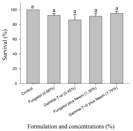 Survival of adult A. colemani exposed to high concentrations of each formulation was between 83.8 and 97.5%, and 100% was achieved for the control (Figure 3). There was no statistically significant difference in the survival of A. colemani between the treatments (F = 1.44; df = 4, 15; p = 0.2698) (Figure 3).