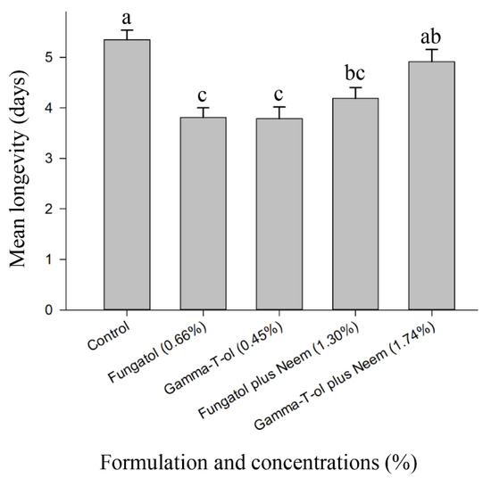 The mean longevity of adult A. colemani exposed to residues of the formulations and control ranged from 3.74 to 5.35 days (Figure 4). There were significant differences observed between the control and the tested formulations (F = 9.47; df = 4, 95; p < 0.0001) (Figure 4). The lowest mean longevity was recorded at 3.74 and 3.81 days for Gamma-T-ol and Fungatol, respectively (Figure 4).