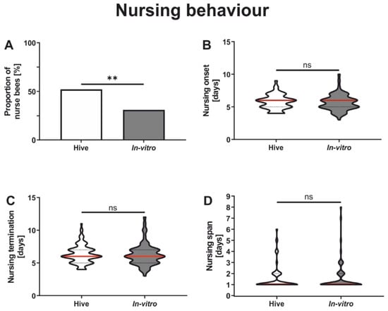 However, nurse bees which actually performed nursing tasks did not differ between rearing conditions. Honeybees reared in vitro started and terminated nursing tasks at a similar age as their naturally reared sisters. Another study investigating nursing behavior of in vitro-reared honeybees showed that these visited queen cells less frequently compared to colony-reared honeybees []. Uncovering the effects of in vitro rearing on the quality of worker and queen brood care could be an interesting question for future studies.
