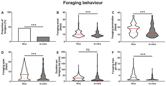 Influence of in vitro rearing on foraging behavior. (A): In vitro rearing significantly influenced the proportion of foragers. Significantly fewer in vitro-reared honeybees became foragers compared to colony-reared honeybees. (B): In vitro rearing significantly decreased the onset of foraging. (C): In vitro-reared honeybees terminated their foraging trips significantly earlier then colony-reared honeybees. (D): In vitro rearing significantly decreased the foraging span. (E): The duration per foraging trip was not influenced by the rearing environment. (F): In vitro-reared honeybees flew significantly fewer foraging trips per day then colony-reared honeybees. Significant differences between groups are indicated by asterisks (ns: p > 0.05, ***: p < 0.001). For test statistics and sample size, see Table 2. Data in (B–F) display medians (red line) and 25% and 75% quartiles (lower and upper dotted lines, respectively).