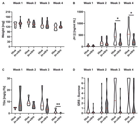 To further investigate whether the difference in vitality also results in a different morphology or physiology, we looked at weight, JH III, TGs and GRS. We did not find any differences in weight between in vitro-reared and naturally reared honeybees. These results support earlier studies []. However, other studies also found in vitro-reared honeybees to be smaller [,]. These different results might be an effect of individually different metabolic needs, as discussed above. JH III increased with age, as frequently observed in honeybees [,,]. However, during the third and fourth weeks of adult maturation, in vitro-reared honeybees had significantly lower JH III titers compared to colony-reared honeybees. These results seem contradictory, especially because in vitro-reared honeybees started foraging earlier. However, in vitro-reared honeybees stopped foraging around 14 days of age on average. Therefore, it is possible that in vitro-reared honeybees simply stopped foraging and returned to the colony to perform other tasks. This would correlate with their lower JH III titers. It has been shown that reverted nurse bees (foragers that go back to nursing) also show lower JH III levels compared to same-aged foragers []. However, it could also mean that the sampled honeybees in week 4 never foraged and, therefore, had low JH III titers. Future studies should analyze both factors simultaneously to uncover why in vitro-reared honeybees show lower JH III titers.