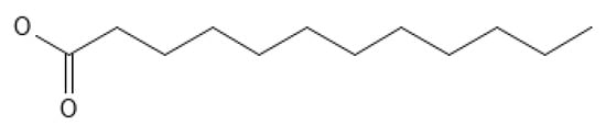 Lauric acid chemical structure, obtained with Draw Structure software by PubChem (https://pubchem.ncbi.nlm.nih.gov/#draw=true (accessed on 8 October 2021)). Myristic and palmitic acids have similar structures to lauric acid, differences are related to side-chain lengths that are composed of 14 and 16 carbons, respectively.
