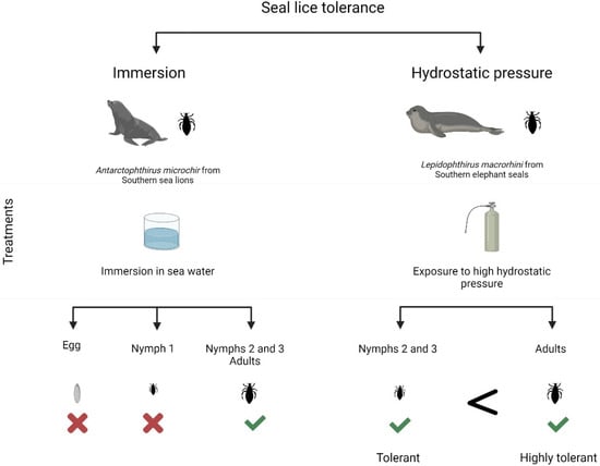 - Leonardi, M.S.; Crespo, J.E.; Soto, F.A.; Vera, R.B.; Rua, J.C.; Lazzari, C.R. Under pressure: The extraordinary survival of seal lice in the deep sea. J. Exp. Biol. 2020, 223, jeb226811. [Google Scholar] [CrossRef] [PubMed]