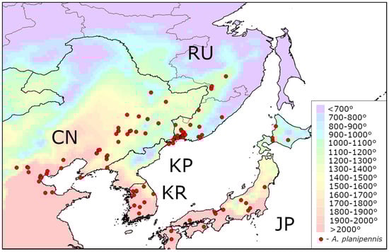 Heat availability in the native range of Agrilus. planipennis in Asia. Mean AGDD10 per year in 2003–2020 is indicated with colours (see the legend). CN—China, JP—Japan, KP—Democratic People’s Republic of Korea, KR—Republic of Korea, RU—Russia. The information about occurrences of A. planipennis was obtained from the review of its native range [3].
