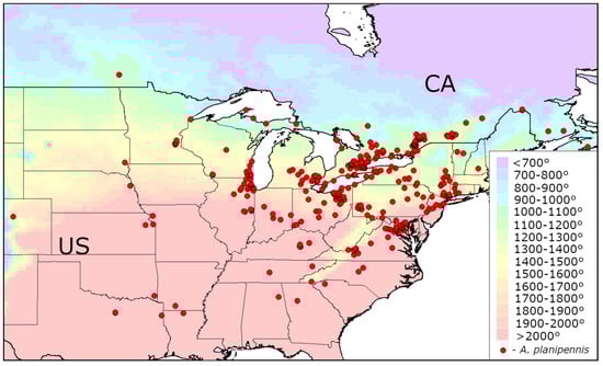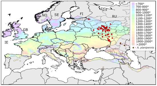 The following are available online at https://www.mdpi.com/article/10.3390/insects13010052/s1, Table S1: Localities, where A. planipennis has been recorded in Asia, North America and Europe; File S1: Detailed description of the calculations of the mean AGDD10. Table S2: Results of calculations: the mean AGDD10 per year in 2003–2020 in each grid square.