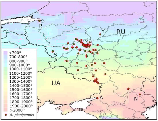 Emerald ash borer Agrilus planipennis (Fairmaire, 1888) (Coleoptera: Buprestidae) is an alien pest of ash trees (Fraxinus spp.) in the USA, Canada, European Russia and Ukraine [1,2]. This beetle, native to East Asia [3], was first recorded in North America in 2002, in Michigan [4] and in Europe in 2003, in Moscow [5]. Since that time, the pest has been spreading over both continents and killing millions of ash trees. Agrilus planipennis is a major threat to ash trees in Europe; it is included in the list of 20 priority quarantine pests of the European Union (EU) [6,7]. Now, the border of the A. planipennis range is just 120 km from the border of the EU; A. planipennis will inevitably appear in the EU soon [8,9]. The most commonly infested ash trees in European Russia and Ukraine are the green ash, Fraxinus pennsylvanica Marsh. This ash species was introduced for landscape plantings from North America in the 20th century and is known to be highly susceptible to emerald ash borer [10]. All ash species native to Europe (Fraxinus excelsior L., F. ornus L. and F. angustifolia Vahl.) are susceptible to A. planipennis [11]. It is very important to assess the potential range of the species in Europe, since it is an essential part in planning measures to mitigate economic and ecological losses from the future outbreak.