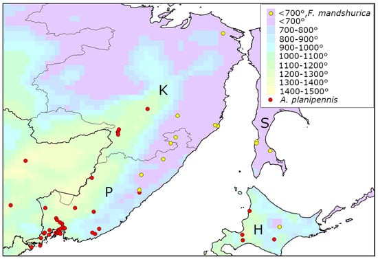 The distribution of A. planipennis in its native range is not only limited by distribution of its host plants [12]. The host plant of A. planipennis in Asia, Fraxinus mandshurica Rupr., [28] occurs on the Sakhalin Island, some districts of Primorye Territory and Khabarovsk Territory, although A. planipennis is absent there [29] (Figure 4). The minimum heat availability (AGDD10) in grid squares occupied by F. mandshurica is 574°, while A. planipennis has been never recorded in the grid squares with AGDD10 below 700°. It indicates that heat availability could be one of the factors limiting the distribution of A. planipennis in the north of its range.