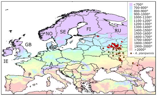 Heat availability in Europe. Mean AGDD10 per year in 2003-2020 is indicated with colours (see the legend). The information about occurrences of Agrilus planipennis was obtained from recent publications [9,19]. IE—Ireland, GB—Great Britain, NO—Norway, SE—Sweden, FI—Finland, RU—Russia, A—Alps, C—Carpathians, K—Caucasus, P—Pyrenees.