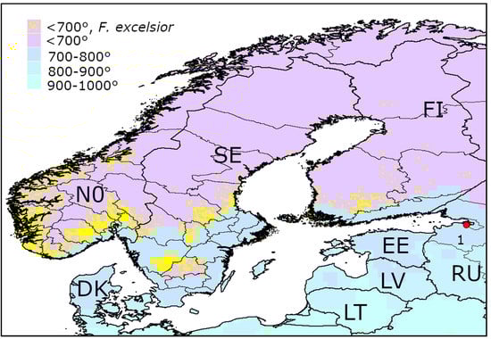 Ash trees of different species are often planted outside their native ranges in Europe. Survival of these artificial plantings is important, but more important is the survival of ash trees in their native ranges, since ash trees play an important role in the communities of broad-leaved forests; hundreds of species of animals, plants and fungi ecologically depend on Fraxinus spp. [7]. The native range of F. excelsior occupies almost the whole of Europe, except the very south and very north (Figure 6). The heat availability is higher than 700° in the most part of the range, except some northern and mountain regions.