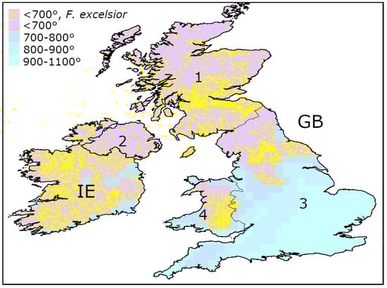 Occurrences of Fraxinus excelsior in the territories with AGDD10 below 700° in British Isles. GB—Great Britain, IE—Ireland. 1—Scotland, 2—Northern Ireland, 3—England, 4—Wales. Mean AGDD10 per year in 2003–2020 is indicated with colours (see the legend). The information about the occurrences of F. excelsior was obtained from Global Biodiversity Information Facility [33,34,35,36].