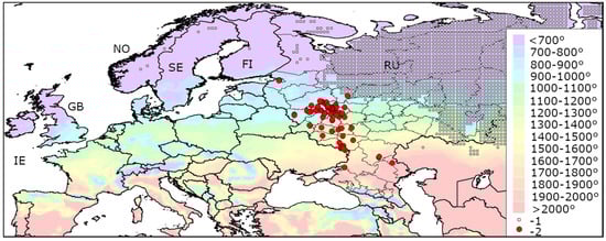 Distribution minimum winter temperature and heat availability in Europe. Mean AGDD10 per year in 2003–2020 is indicated with colours (see the legend). 1—territories, which are not suitable for Agrilus planipennis establishment because of the extreme winter cold [15], 2—localities of A. planipennis. FI—Finland, GB—Great Britain, IE—Ireland, NO—Norway, RU—Russia, SE—Sweden.