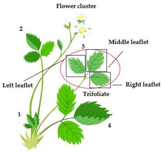 Diagram of the trifoliate leaf and its relative positions within a strawberry plant for sampling T. urticae in this study. Within a trifoliate leaf, the left and right leaflets were separated based on the middle leaflet. The numbers above trifoliate leaves indicate the numbering for sampling T. urticae. Numbering was started from newly developed leaves to older ones according to the leaf age. The flower cluster was separately recorded.