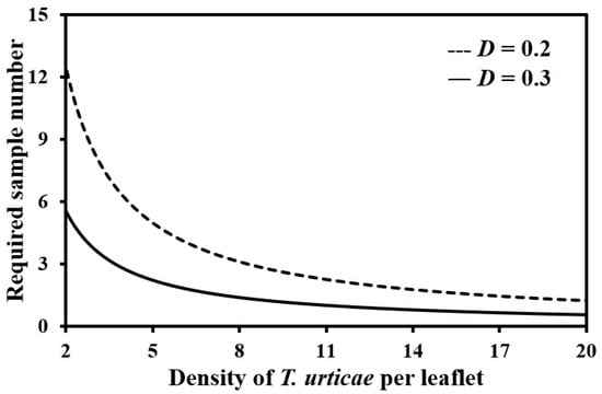 In this equation, N = required sample number, D = precision level (mean/standard error), and m = mean density of T. urticae.