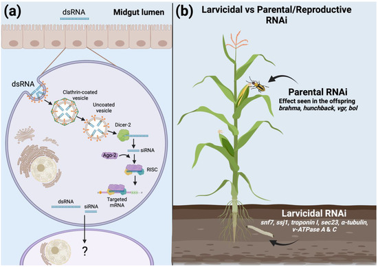 (a) Overview of the known RNAi uptake and processing mechanism in the western corn rootworm; (b) list of dsRNA gene targets active against the western corn rootworm subsequently transformed into maize.