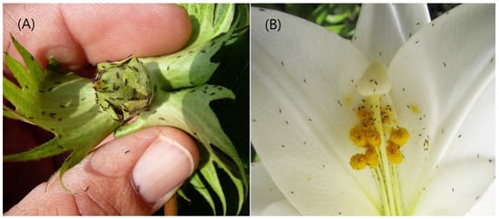 Worldwide, the two most important pest species in the genus Thrips are T. palmi and T. tabaci. Both of these are Orthotospovirus vectors, and although flower-living they both cause serious feeding damage on the leaves of some plants that they attack. The Melon Thrips, T. palmi, is a major pest in tropical countries [55], sometimes almost defoliating crops of Eggplant (Solanum melongena) (Figure 3B), although it also causes serious damage to crops of other Cucurbitaceae related to melons. Similarly, the Onion Thrips, T. tabaci, is highly polyphagous and particularly known as a pest of species in the genus Allium. However, it causes considerable damage to Brassica crops and is sometimes associated with distantly related plant species such as wheat (Triticum). However, T. tabaci shares with Frankliniella schultzei the ability to be a beneficial insect when it acts as a predator on mites, including Eriophyidae [56].