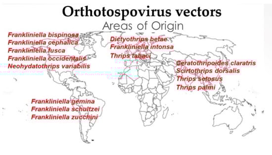 Before considering the pest status among the 1800 known species in this subfamily it is important to emphasise that less than 1% of these species are recorded as vectors of the serious crop diseases known as Orthotospoviruses [36]. With the exception of Neohydatothrips variabilis in the Sericothripinae, the other 14 species recorded as vectors of this group of plant viruses are all members of the Thripinae, and these species are members of five different genera (Figure 2). Eight vector species are members of the genus Frankliniella: three are members of the genus Thrips; the remaining three are each placed in different unrelated genera. This suggests that the association between thrips and the various Orthotospovirus species has arisen independently several times and on different continents. Zhang et al. [36], in recognizing 30 species of Orthotospovirus stated that 17 of these are reported from China (including undescribed species). However, no known vector species is endemic to China, although Thrips palmi is possibly native in the tropical southwest of that country. In contrast, eight of the 15 thrips vector species are originally from the American continent, with five from North America, and three from South America (Figure 2).