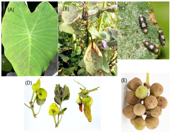 Feeding damage by thrips. (A) Biltothrips minutus markings on leaf of Taro (Colocasia esculenta). (B) Thrips palmi damage to aubergine crop (Solanum melongena). (C) Dendrothrips ornatus on Ligustrum leaf. (D) Damage to Capsicum fruits by Franklliniella occidentalis and Orthotospovirus. (E) Surface damage to grapes (Vitis vinifera) by Scirtothrips dorsalis.