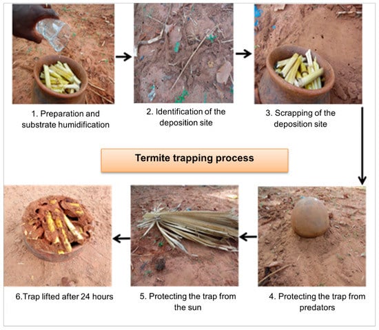 11]. The general procedure was as follows: Substrates were placed in the container and moistened with water; the reversed container was placed on scraped soil at a site previously selected as suitable for termite trapping; the trap was protected from predators by closing the borders of the container with soil and from sunlight by covering it with leaves of palmyra palm; at the end of the trapping period, the trap was lifted and emptied. The process is illustrated in