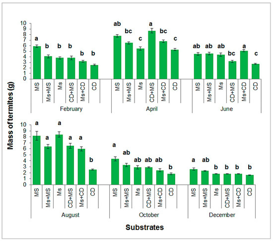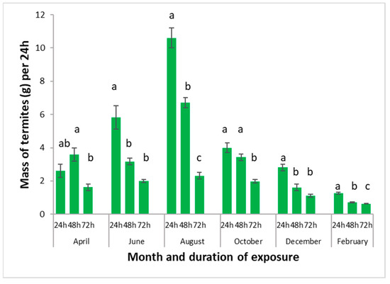 3. Analyses on the effect of duration of exposure (24, 48, and 72 h) were conducted on the weight of dry termites produced per 24 h. The normality of the data and the homogeneity of the variance were tested using the Shapiro–Wilk test and the Fligner test. Based on these, statistical tests were selected for the comparisons of means. To assess the effect of the type of containers on the weight of the termites harvested, the Kruskall–Wallis test was used. To assess the influence of substrates, seasons, sites, volume of container, and harvesting hours, one-way and two-way ANOVAs (with a month as the second fixed factor) were performed. The comparison of the means was carried out with the Student–Newman–Keuls test or the Tukey test at the 5% level.
