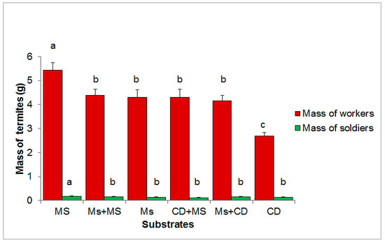 For all substrates tested, the number of soldiers harvested was very small compared to the high number of workers (from 2.7% to 5.2% in weight but much less in numbers because soldiers are much heavier than workers). The role of workers in the termite mound mainly consists of harvesting and transporting plant debris from outside to the termite mound [