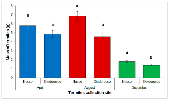 8]. A solution to avoid injuries would be to dry the termites, as done in our studies, but the extraction of termites from the substrate would be too time-consuming for the farmer. It is likely that methods involving the collection of termites directly from mounds may result in a higher proportion of soldiers, even though farmers have developed techniques to avoid the collection of a high quantity of soldiers even when termites are collected from the mounds [