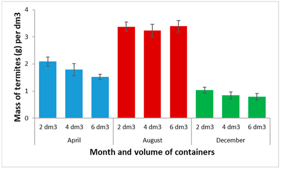 The use of terra cotta pots of different sizes during three different months (April, August, and December) shows that the quantity of termites harvested is proportional to the volume of the terra cotta pot, at least within the range of the volumes tested in this study. Thus, the larger the pot, the greater the quantity of termites harvested.
