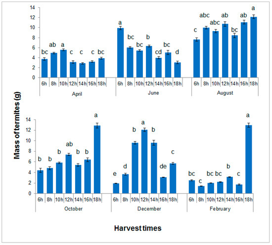 33]. The fact that large quantities of termites are collected at different times of the day could be explained by the terra cotta’s thermoregulatory capacities, which could favor the termites’ daytime activity. In addition, the terra cotta pots do not allow daylight to pass, which could also be favorable for termite activity. Termites of the genus