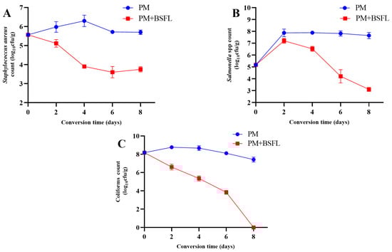 Black soldier fly (BSF) larval inactivation of Staphylococcus aureus (A), Salmonella (B), and coliforms (C) in pig manure. Each point represents the mean of three independent trials (n = 3).