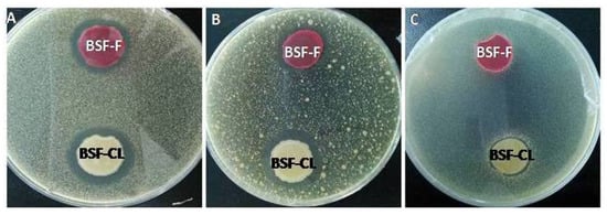 A total of 11 strains have been isolated from the gut of the BSF larvae. Two strains coded BSF-F and BSL-CL showed clear antagonistic activity and identified as Serratia marcescens and B. subtilis (Table 2). The results showed that both antagonistic microorganisms inhibited the growth of S. aureus and E. coli with varying efficiencies (Figure 2A,B). Salmonella spp. was sensitive to the BSF-CL strain but not to the BSF-F strain (Figure 2C).