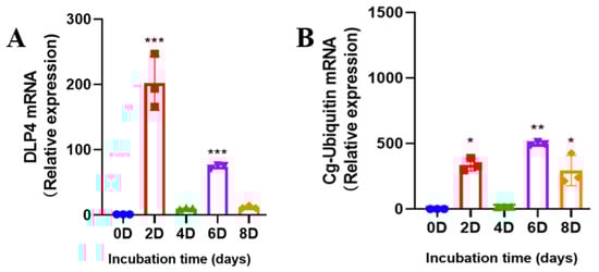Quantitative real-time PCR analysis of DLP 4 and Cg-ubiquitin mRNA expression. (A) Temporal expression of the DLP4 transcripts in the larvae of BSF collected from the PM at different time points (zero, two, four, six, and eight days). (B) Temporal expression of Cg-Ubiquitin transcripts in the BSFL collected from PM at different time points (zero, two, four, six, and eight days). Statistical analyses were performed using ANOVA (* p < 0.05, ** p < 0.01, *** p < 0.001), and the data were analyzed compared with those on day 0.