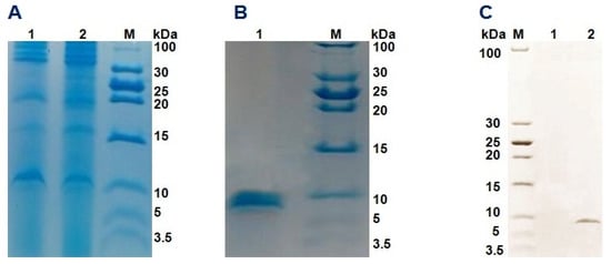 The P. pastoris colony with the highest DLP4 production was chosen for the large-scale peptide expression under optimal conditions, and the maximum secretion of recombinant DLP4 was observed after 96 h of incubation at 28 °C (Figure 4A). The His-tag in the N-terminus was affinity-purified using Ni–NTA materials. Approximately 15.8 mg of pure recombinant DLP4 was obtained from 500 mL of YPD culture. A 6.9 kDa single band was observed on the Coomassie blue-stained Tricine-SDS-PAGE gel as shown in Figure 4B. The expression efficiency was detected with immunoblot analysis, in which 100 μg/mL from the purified protein were applied into the Tricine-SDS-PAGE (16.5%) prior to the Western blot assay. The result revealed that the purified recombinant DLP4 was specifically recognized by the mouse anti-His (C-term) antibody as illustrated in Figure 4C.